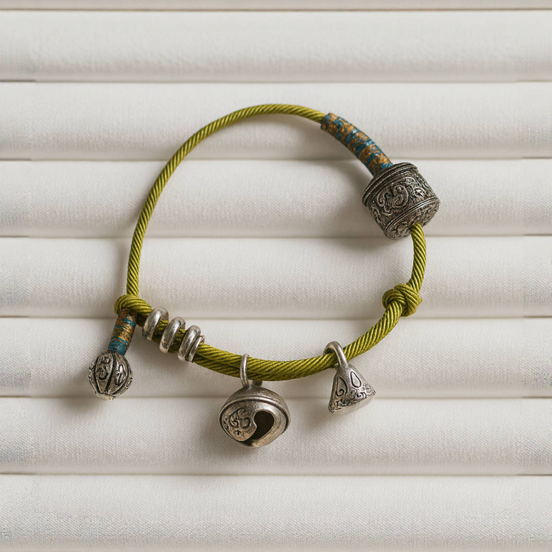 Find daily inspiration with the Six-Word Mantra Tibetan Bell Green Thread Bracelet – Peace & Vitality, a distinctive accessory woven from symbolic green thread and vintage-style Tibetan silver bells, designed to bring clarity, protection, and joyful serenity into your day.